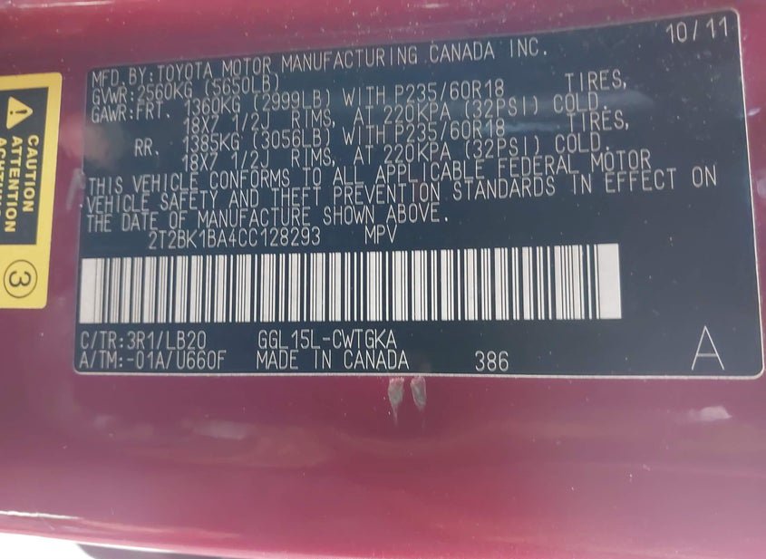 VIN: 2T2BK1BA4CC128293 · New Castle, DE, 19720 · NY Mv-907A